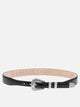 Cintura "Palladium" in pelle Adriano Meneghetti, costruita in vitello pieno fiore stampato coccodrillo. La silhouette mantiene una struttura lineare e rigida, con profili netti e spessore uniforme. Il cinturino si articola in una fascia continua e regolare, interrotta dalla fibbia rettangolare in ottone massiccio con placcatura argento inglese, integrata tramite un'asola cucita a mano. La superficie presenta una trama in rilievo, effetto coccodrillo.