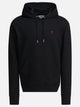 Ami Paris "Ami de Coeur" hoodie made of uniformly textured loopback cotton fleece. The silhouette is defined by a classic cut, with an adjustable hood via drawstrings fitted with silver metal finials. The chest features Ami de Coeur embroidery in black, while the back neck base is finished with tone-on-tone "ami" embroidery. The construction features regular stitching and functional details.