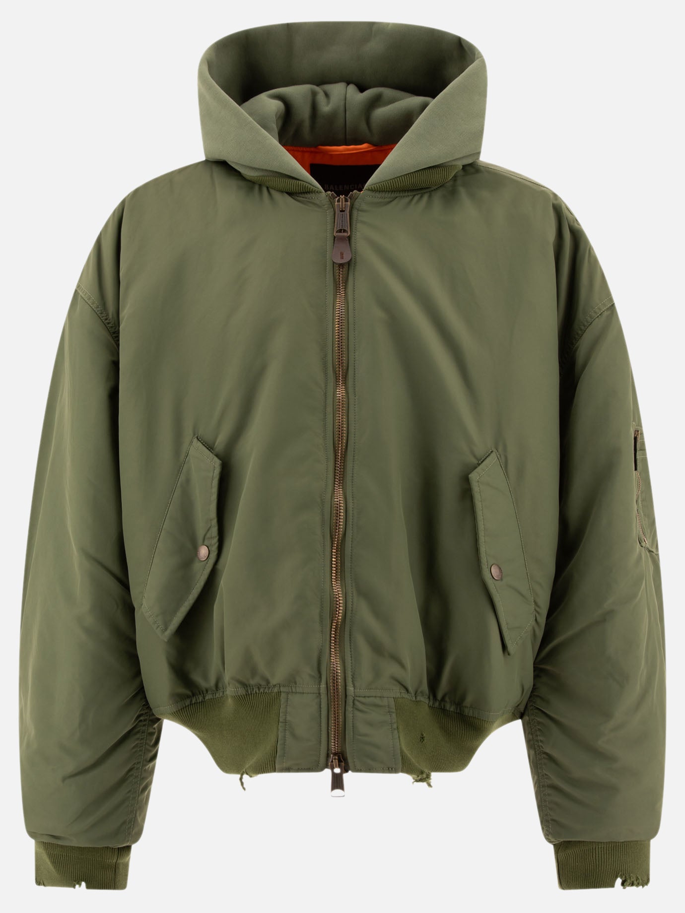 Balenciaga's Bomber Jacket with Contrast Interior is a distinctive garment that stands out for its contemporary look and superior quality. Made of medium fleece and vegetable-dyed nylon, it features a solid color and an oversized fit, ideal for a casual yet sophisticated look. This bomber jacket is perfect for the modern man who likes to combine comfort and style in one garment.