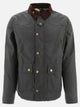 Barbour "Reelin" jacket, made of waxed cotton with quilted tartan lining. The construction features a straight cut, minimal lines and regular silhouette. Heavy corduroy collar adds tactile texture. It features functional details such as patches on the shoulders for reinforcement, front-facing zippered handwarmer pockets and a center closure. The Barbour logo results embroidered on the left pocket flap.