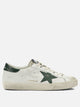 Golden Goose "Super Star" sneaker features a leather upper with a worn-effect treatment, featuring machine-stitched side panels. The construction consists of a rubber sole with a vintage finish and visible stitching along the profile. The model includes the iconic side-applied star, back heel with contrasting logo and logo details on the tongue. Lacing is via cotton laces.