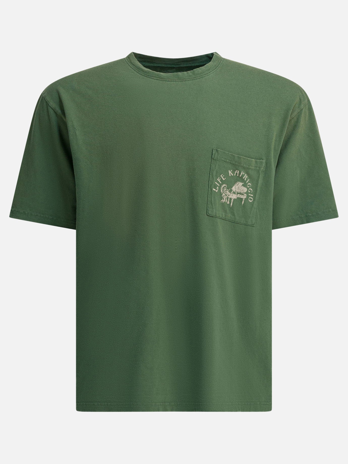 Kapital "Life Capriccio" T-shirt, made from second-hand jersey, features a paneled construction with visible seams and a straight silhouette. The garment includes a patch pocket on the chest, featuring a print of a Native American playing a grand piano. The construction is lightweight and the collar cleanly finished. Sleeves are regular, standard lap cut.