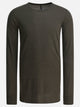 Rick Owens viscose crewneck T-shirt with lightweight construction and elongated silhouette. The main fabric provides a smooth, defined surface, while the raw-cut hem adds sharp detail to the finish. The long sleeves are stitched with linear construction, with no decorative breaks. The collar features subtle trim, keeping the line clean and minimal. Suitable for layering or as a single layer in total simplicity.