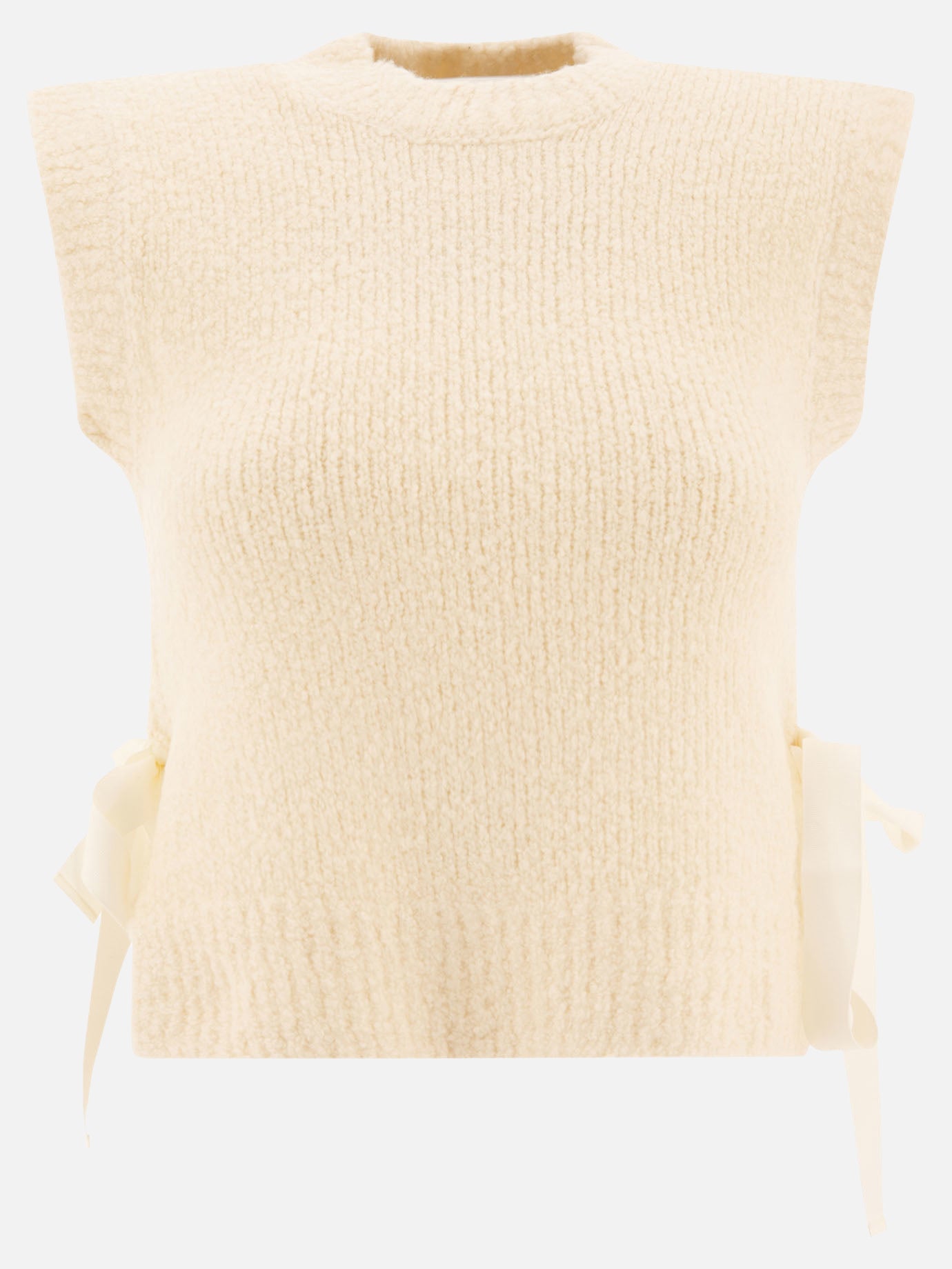 Cecilie Bahnsen's "Owen" vest is the epitome of Scandinavian simplicity combined with an irresistible romantic touch. Made of a soft bouclé knit, the vest offers a warm and comfortable embrace with two elegant side bow closures that add a touch of femininity. Perfect for any woman who desires an essential yet chic garment, boasting a regular fit and versatile solid color.