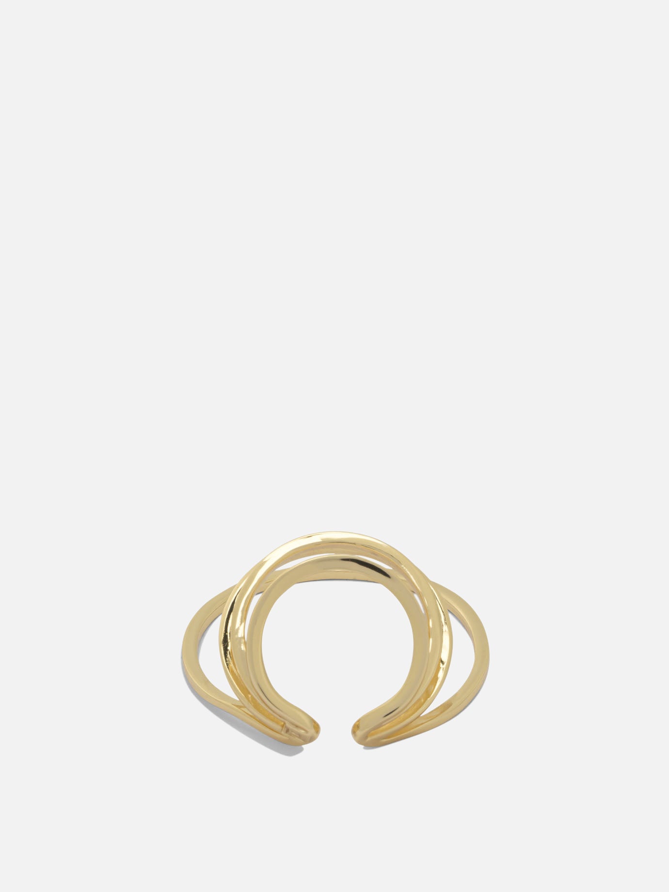 Federica Tosi "Kate" earring made of brass subjected to 18k gold plating. Ear cuff structure, without a hole, molded to adhere to the contour of the ear by gentle pressure. Essential silhouette with smooth surfaces and continuous curves, free of pendant elements. Unique piece is distinguished by continuous construction, with no visible clasps or additional inserts.