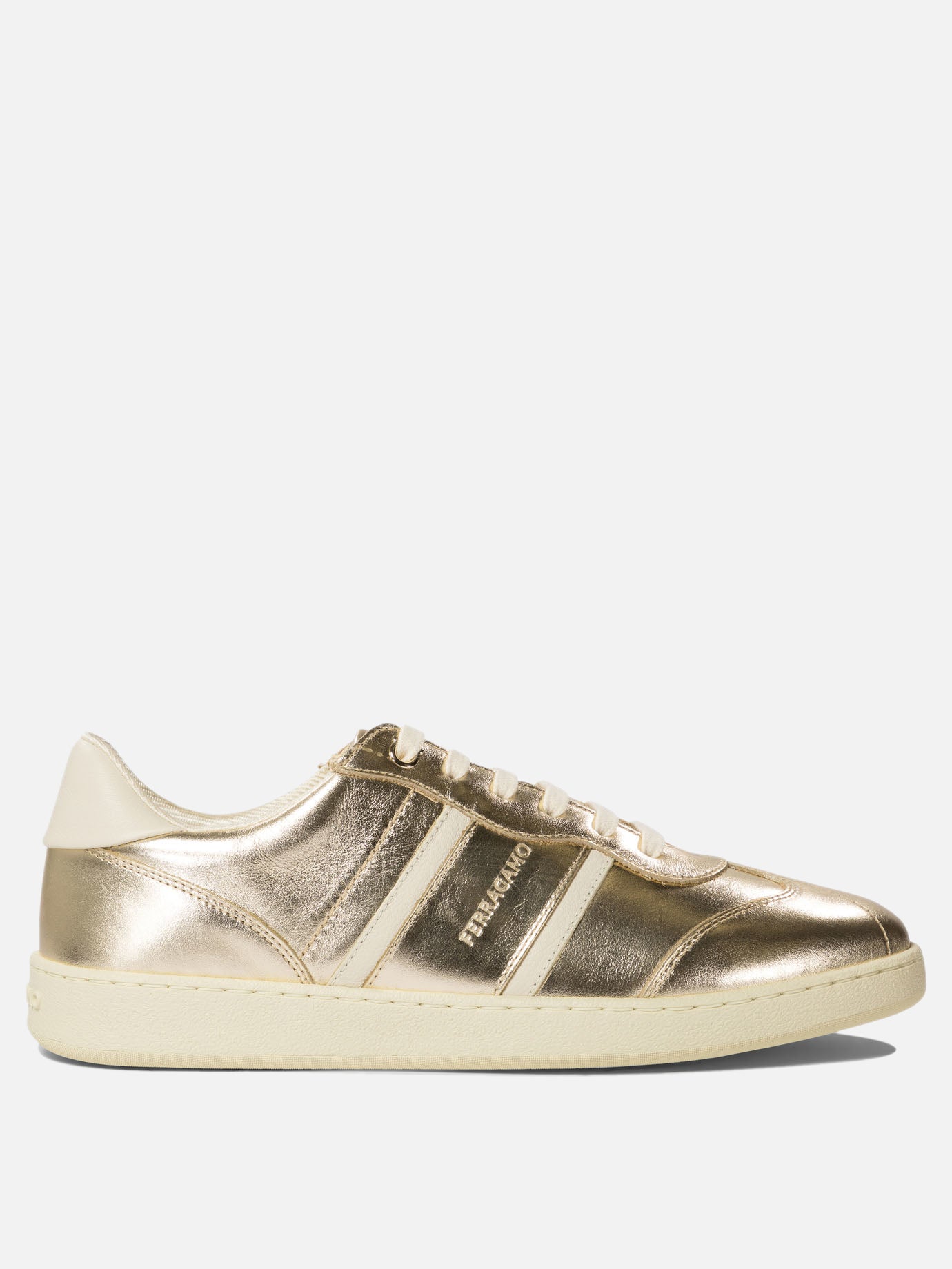 Sparkling and sophisticated, Ferragamo's "Achille" sneaker combines vintage design and modern details to offer women an exclusive shoe. This sneaker is ideal for those seeking to combine comfort and elegance in one product to be worn on a variety of occasions.