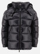 Moncler "Maire" Down Jacket. Short model with down and feather inner filling, made of shiny laqué nylon with matching inner lining. The structure features a wide silhouette and straight lines, the hood is removable via a concealed zipper, and the front closure is integral with a metal zipper. The side pockets are zipped and the cuffs are adjustable with snap buttons.