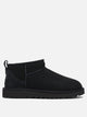 Ugg "Classic Ultra Mini" ankle boots constructed with 17 mm inverted sheepskin upper and lining, short construction with 8.9 cm shaft. They feature asymmetrical top edge, exposed overlock stitching, rear pullback and suede buttress. The sole, made of Treadlite by UGG™ or sugarcane EVA, provides lightness and flexibility. Water-repellent treatment applied to the rear for added aesthetic protection.